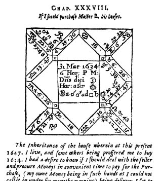 Знаком восходящим являются Весы, градус знака тот же самый, в котором Юпитер был в моем радиксе. Я сразу посмотрел на это, как на хорошее предзнаменование. Венера – для меня, Солнце, расположенное в седьмом, – для продавца. Солнце воспринимает Венеру в своей экзальтации; кроме того, Венера расположена рядом с куспидом седьмого, и нет другой планеты в седьмом, кроме Солнца, это означало, что на тот момент не было другого покупателя на это, кроме меня. Солнце в экзальтации и угловое отмечало высокие запросы продавца [и они были таковыми], и не было ему нужды отходить от них. Нахождение, как я говорю, моего сигнификатора воспринятым Солнцем и столь близко расположенным к куспиду западного угла было доказательством того, что мне следует продвигаться далее в этом деле, несмотря на Венеру, на ее многие слабости. Поскольку я обнаружил, что Солнце, господин седьмого, также было и господином одиннадцатого, означая, что моим надеждам не должно быть разрушенными. Кроме того, Венера апплицировала к тригону с Сатурном, господином четвертого, viz. домов, о которых спрашивалось, и не было прерывания или фрустрации прежде точного аспекта – главное сильное доказательство того, что я куплю эти дома. И действительно, оба сигнификатора уверенно апплицировали к аспекту тригона, viz. Сатурн и Венера, поскольку Сатурн ретроградный. Я еще рассудил, что Солнце было в точном тригоне с Сатурном; Солнце, как я сказал, является господином моего одиннадцатого, а он – четвертого; Сатурн также обозначает меня, как кверента, поскольку он созерцает асцендент и у него там экзальтация. Теперь, рассмотришь ли ты его, как имеющего достоинства в асценденте или как господина четвертого, господин одиннадцатого и он апплицируют друг к другу тригоном, доказывая, что мне, несомненно, следует продвигаться далее в этом деле, а в конце выполнить его. На следующем месте Луна, передающая влияние Марса, у которого есть достоинства в седьмом, Сатурну, имеющему силу в асценденте, хотя и аспектом квадратуры (однако из знаков долгого восхождения), изрядно способствовала делу и подтверждала мое продвижение и возможность заключения сделки, но с некоторым ожиданием и медленностью по причине аспекта квадратуры. Ибо раз Луна поражена, а Венера несчастлива, мне нужно было много сделать и провести много встреч по поводу этого; продавец не сбавлял ни пенни с пятисот тридцати фунтов, что были первоначальной ценой, которую он потребовал. Поскольку Солнце близко к аспекту секстиля с Юпитером, то юпитерианский мужчина попытался обеспечить эту покупку себе [это было после того, как я начал, и перед тем, как я закончил]. Но Юпитер падающий и в изгнании, показывающий, что ему не должно одержать верх, Венера угловая и в аспекте с Сатурном, господином искомой вещи. А поскольку Солнце является господином одиннадцатого, который есть пятый от седьмого, то дочь продавца была моим очень хорошим другом в этом деле, и не позволила никому вмешаться, хотя некоторые предлагали девушке деньги [чтобы помешать мне]. Марс, господин моего второго, ретроградный и доказывает, что мне не следует брать свои деньги для этого дела, я и не взял. Юпитер, господин Жребия Фортуны, в секстиле с Солнцем, никак не воспрепятствованный, кроме пребывания в изгнании, в платик секстиле с Венерой, госпожой моего асцендента, вскоре вступающий в 
