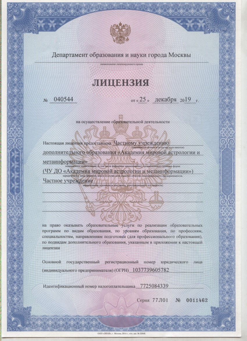 Академия мировой астрологии и метаинформации имеет бессрочную образовательную лицензию Департамента образования г. Москвы на ведение образовательной деятельности в области дополнительного образования по утвержденным программам с правом выдачи диплома, установленого законодательством образца. Обращаем ваше внимание на то, что только имеющие гослицензию образовательные учреждения имеют право выдачи соответствующих документов: дипломов, сертификатов и т.п.