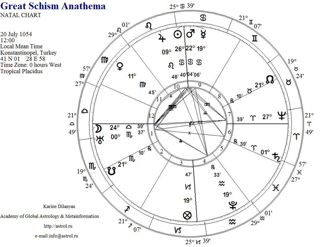 В 1054 году произошел великий раскол христианской церкви. Ниже приводится гороскоп, построенный на 20 июля 1054 года, на полдень - на время, когда патриарх предал анафеме папских легатов. В карте восходят Луна в соединении с Ураном в Весах (Уран в 1 градусе Скорпиона), ось лунных узлов проходит через 22 град Тельца, на куспиде 8-го дома, в Центре Неба - Марс в соединении с Солнцем в Раке 22-26 град.