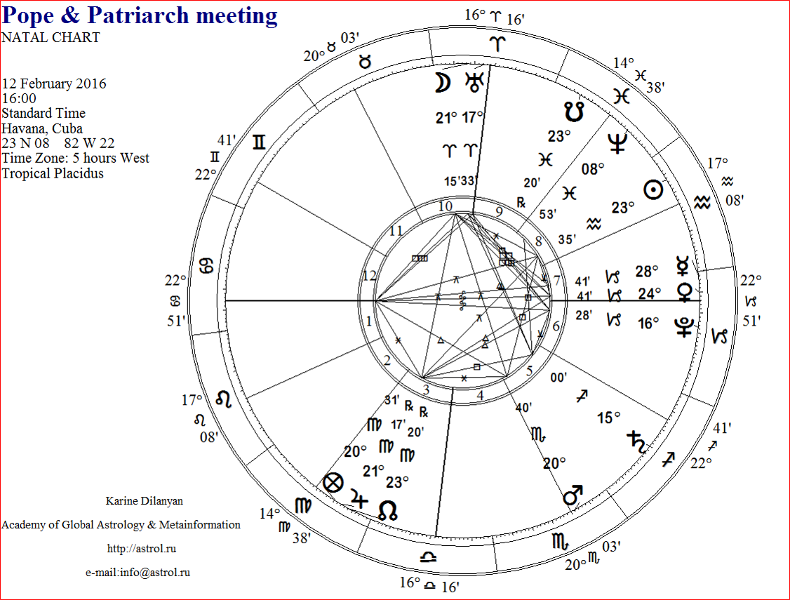 В карте восходит 22 град Рака - тот, где в карте схизмы находятся Марс и Солнце раздора. В седьмом доме - партнерства, а также доме приезда находятся две планеты: Меркурий и Венера - управляющие 3-м домом - близких родственников и 11-м домом - надежды. Они попадают в четвертый дом - конца вещей - карты схизмы. Обе планеты - перегрин (только Венера имеет небольшое достоинство) - перегрин - это от пилигрим - странник, как нельзя лучше характеризует место встречи двух иерархов - аэропорт Гаваны. Единственная сильная планета этой карты - Марс в Скорпионе, знаке смерти и возрождения, который управляет 10-м домом - цели и судьбы в этой карте. Помним, что встреча посвящена спасению убиваемых и гонимых христиан. Куспид 11-го дома - надежды, а также дома Бога, находится в 20 град. Тельца, на оси лунных узлов карты схизмы. На Южном узле карты схизмы стоит нынешний Марс в Скорпионе (для любителей кармической терминологии скажем, "сжигающий отрицательную карму". Для нелюбителей скажем - уничтожающий разрушительное влияние Южного узла. На фоне слабых положений планет, смотрим на положения жребиев: жребий фортуны (Луны) находится в соединении с Юпитером и Северным узлом в Деве в 21 градусе, жребий Духа (Солнца) расположен в 25 град. Тельца. Юпитер образует трин к ЖД в Тельце и соединение с ЖФ в Деве, к ним образуют трины Меркурий и Венера из Козерога, из 24-28 град. Мысленно соединим эти градусы и увидим треугольник в земных знаках,через вершину этого треугольника проходит горизонталь: асцендент-десцендент. Получаем рисунок копья, древко которого упирается в соединение Меркурий-Венера в Козероге, а заканчивается в 23 град. Рака. Именно через этот градус может произойти разрушение старых негативных программ, заложенных в первой карте - великого раскола. Для почитателей Сабианских градусов: вот как расшифровывает Дейн Радьяр значение градуса Середины Неба (16 Овна) - "две достойные сестры, сидящие в тишине". Про Луну - нужно говорить отдельно, так что, продолжение следует...