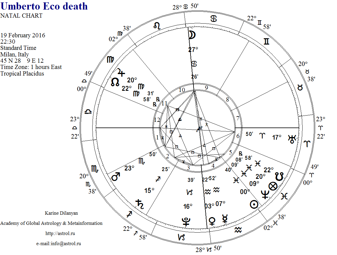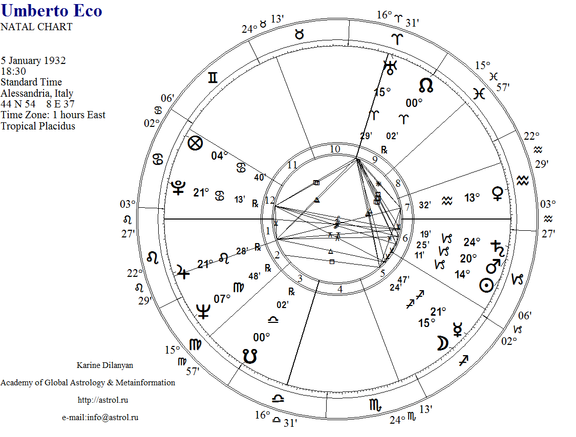 В гороскопе рождения не могут не восхищать вредители, расположенные в эссенциально наилучших местах: Сатурн и Марс в Козероге. Лунные узлы на оси весеннего/осеннего равноденствия и великолепный трин Юпитера с Меркурием (ну, и, про Уран, конечно, помним).