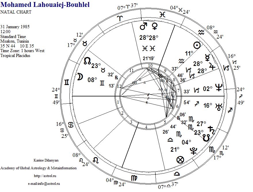 Очень странный теракт, очень странный исполнитель: никаких связей с экстремистскими группами, никаких сообщников, адреса, пароли, явки отсутствуют, в мечеть, по свидетельству соседей не ходил и вообще не молился. Мохаммед Лахуайедж Бухлель родился 31 января 1985 года в Тунисе, здесь приведена карта, построенная на полдень, точное время рождения неизвестно.
