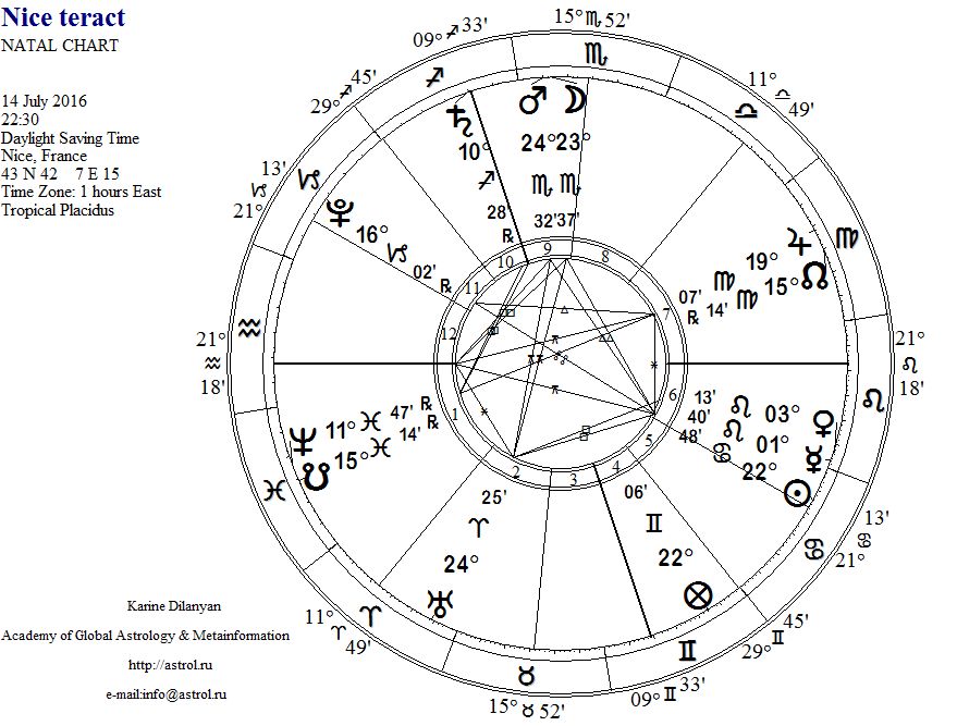 Действительно, он переживал не лучшие времена – транзит Марса через Южный Лунный узел в соединении с Сатурном в Скорпионе в натальной карте указывают на период большой эмоциональной и психологической нестабильности. Транзитная Луна, являющаяся «спусковым крючком» события – активизируют эту комбинацию. Заметим, что происходит это в оппозиции к неподвижной звезде Алголь. Транзитный Сатурн в оппозиции к натальной Луне – тоже повод для депрессии. Словом, по моему впечатлению, это не фанатик, религиозный экстремист и т.п., а человек, находившийся в тяжелом эмоциональном состоянии, решивший свои проблемы, захватив на тот свет несколько десятков человек, также, как Андреас Любитц в небе над французскими Альпами. |