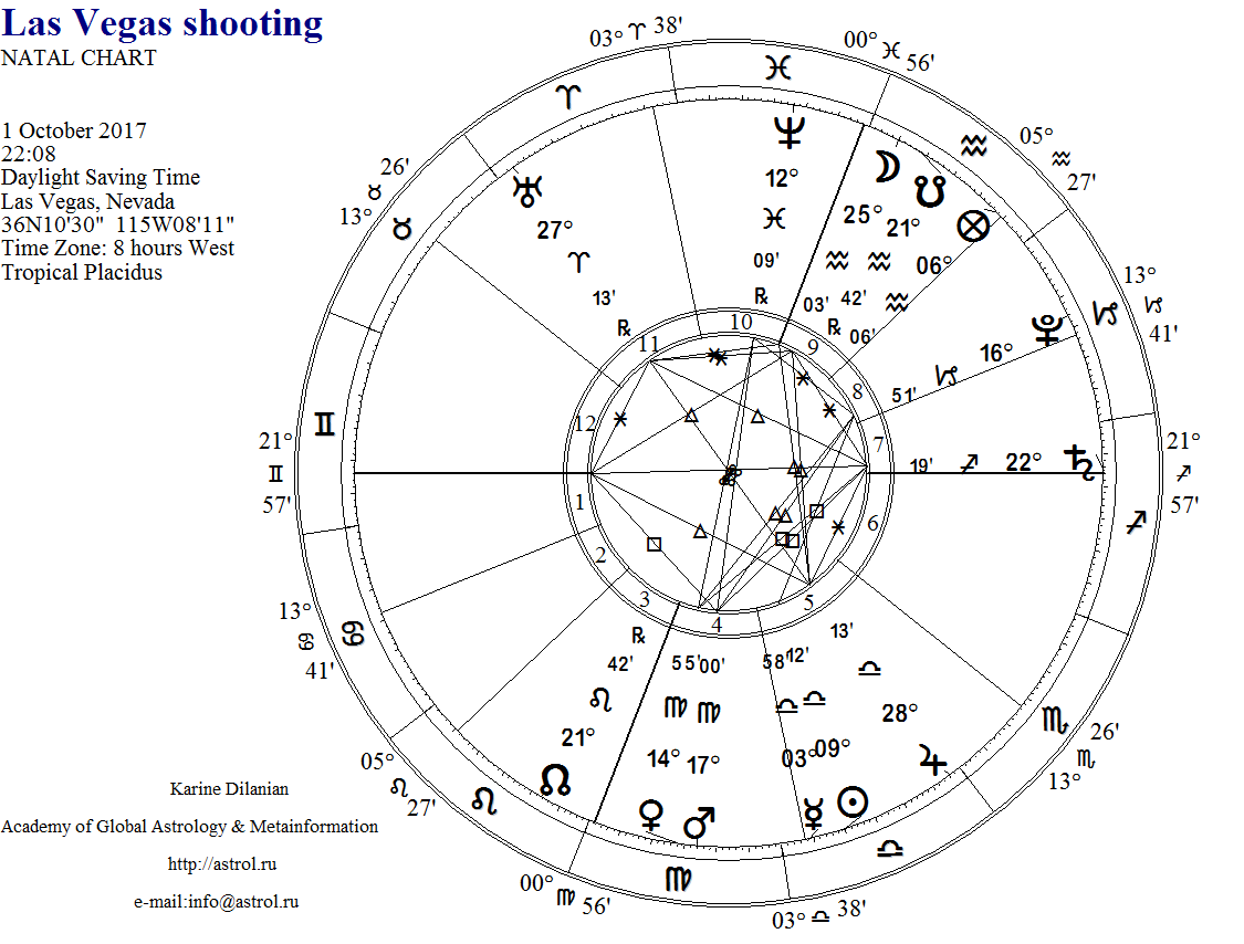 Текущий транзит Сатурна (карта стрельбы) в оппозиции к Марсу в 7-м доме карты США. Луна карты стрельбы в соединении с Луной карты США, которая управляет 8-м домом карты США, Марс управляет 4-м (конца вещей) и 12-м (врагов). Марс США в соединении с натальным Солнцем Трампа, натальная Луна в соединении с транзитным Сатурном. Луна США и Луна стрельбы в Лас Вегасе в оппозиции с натальным Марсом Трампа и в оппозиции к его асценденту. То есть затронуты очень чувствительные точки как гороскопа США, так и гороскопа Дональда Трампа: 21 град на оси бЛизнецы- Стрелец, 27 градусов на оси Водолей- Лев. |