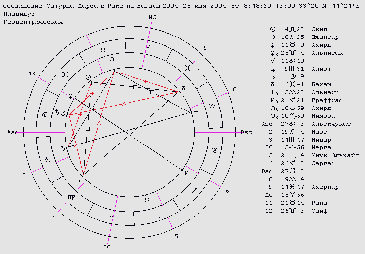 Кровопролитие в Ираке в 2004 году было, возможно, большим, чем в 2003 г., когда США вторглись в Ирак и вели там боевые действия. Часто соединение Марса и Сатурна в Раке сигнифицирует изменения в верховной власти Ирака.