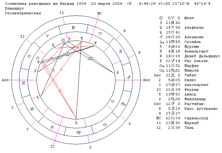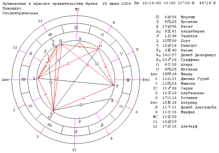 28 июня 2004 года в 10:26 по местному времени было приведено к присяге Временное правительство Ирака, сформированное США из представителей различных политических групп страны. Правление, действительно, «перешло к другой семье», однако, восходящий Юпитер и хозяин девятого дома – Венера на МС недвусмысленно указывают на «руководящую и направляющую» руку.