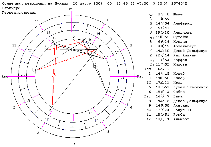 В карте соединения Сатурн находится в параллели с Луной, что может указывать на неблагополучие в морских и прибрежных регионах, возникновение затоплений, ураганов, штормов и т.п. Солнечная революция, построенная на эпицентр цунами в Юго-Восточной Азии, 26.12.2004[5]
