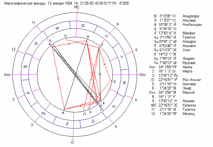 Cвой труд "Иероглифическая монада" Джон Ди начал писать13 января 1564 года в Антверпене и закончил через 12 дней - 25 января 1564. Сами по себе числа: 12, 13 и 25 исполнены тайного смысла. 12 не вызывает удивления - это классическое число, составленное из тройки и четверицы: четыре стихии и три состояния вещества, три алхимических принципа "tria prima", четыре элемента и четыре стадии алхимического процесса. Алхимические принципы определяют человеческую индивидуальность. "Сера" воплощает душу, под которой понимались чувства и желания. "Соль" представляла тело. "Ртуть" олицетворяла дух, охватывающий воображение, суждение о нравственности и высшие умственные способности. Четыре стадии алхимического процесса указывают на различные стадии эволюции души. Но 13 и 25 это то, о чем Ди говорит в "Иероглифической монаде" с великой осторожностью, называя их большой тайной. Это числа "плодов", познать смысл которых может лишь понимающий. 13 и 25 Ди называет "силой Христа в земном человеке", говоря о способности воздвигнуть "святой храм в Господе" (Еф., 2, 21). Будучи астрологом, Ди, конечно же, не мог начать изложение своего труда в день, который не был бы выбран заранее. Элективная астрология (или астрология инцепции - "начала") опирается на представление о том, что весь универсум пронизывает активная творящая космическая сила, а человеческий микрокосм становится центром, связующим звеном, необходимой частью вселенской каузальной сети, всех действующих сил и влияний. Взаимодействие этих космических сил превращало телесное в духовное, чувственное в волевое, интеллектуальное в действительное. Для того чтобы целенаправленно действовать в этом мире сил, волн и эманаций, нужно было уметь использовать определенные правила, в частности, уметь привлекать и усиливать необходимые энергии. Звездные, "астральные" эманации были необходимой составляющей в этой бесконечной цепи. Астрологическое же время было активной, изменяющейся, действующей силой, а не однородным однонаправленным вектором. Время помогало адепту умножить свою личную энергию для достижения нужной цели. Итак, посмотрим на гороскоп начала написания "Иероглифической монады".