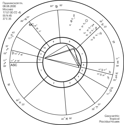 К списку громких преступлений, которые связаны с взрывами в российских городах, добавилось еще одно - 8 августа, вечером, в многолюдном подземном переходе под Пушкинской площадью неизвестными была взорвана адская машина, унесшая 12 жизней и покалечившая еще несколько десятков человек. Информационные агентства передавали: "По сообщению очевидцев, взрыв прогремел примерно в 17:57 по московскому времени у коммерческой палатки № 40 под зданием на пересечении Тверской улицы и Тверского бульвара [1]". В 18:00 по телефону сотовой связи в Службу спасения поступил звонок о взрыве в переходе на Пушкинской площади - с этого времени началась операция по спасению пострадавших [2]. В этот день Москва подтвердила свое звание самого "взрываемого" города в мире, а сам терракт стал очередным "слепым" взрывом, мотивы и цели которого остаются не выясненными. Не пытаясь подменить собой следователей, мы можем воспользоваться средствами астрологического анализа, для того, чтобы определить структуру связей сигнификаторов и характер их взаимоотношений и, возможно, составить свое собственное представление об этом событии. Общая конфигурация карты вполне отвечает качеству события: управители всех углов расположены в неблагоприятных домах, а из всех планет септенера, только Сатурн находится в положении в благоприятном V доме, однако тот факт, что он занимает последний градус знака, в общем, трактуется как отражение кризиса в тех сферах, которыми он управляет. Его положение признак того, что назрели условия для перехода в новую фазу опыта. Исследуя главные элементы данной карты, в первую очередь нам следует обратить внимание на связь планет с VIII домом, так как обстоятельства и характер исследуемого события достаточно четко укладываются в область его символических значений. По словам Павла Александрийского, планеты имеющие отношение к этому дому указывают на тех, "кто получает выгоду от смерти". Следующими важными указателями могут стать перегринные планеты, которые часто указывают на злоумышленников. Однако, прежде всего, наше внимание должен привлечь Марс, который традиционно сигнифицирует преступников. По словам Птолемея, с ним "связаны насилие, нападения, беззаконие, поджоги и убийства, ограбления и пиратство". Действительно, занимая знак Льва, Марс находится в положении перегрин и ослаблен лучами Солнца. Его воздействие достаточно ярко проявляется в характере ранений пострадавших от взрыва, это ожоги, контузии, порезы, переломы …